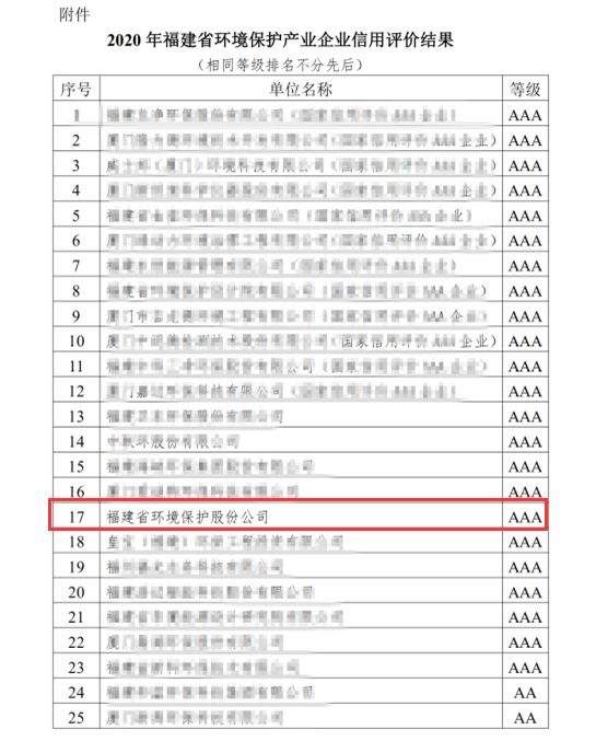 喜報(bào)!福建省環(huán)境保護(hù)股份公司獲評福建省環(huán)保產(chǎn)業(yè)企業(yè)信用評價AAA等級