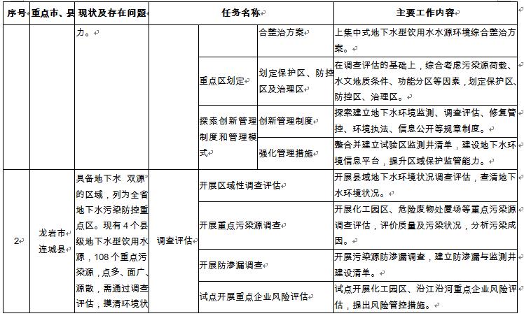 1.區(qū)域地下水環(huán)境狀況調(diào)查評(píng)估。在九市一區(qū)開展市級(jí)的地下水環(huán)境狀況調(diào)查評(píng)估,摸清區(qū)域地下水環(huán)境質(zhì)量狀況。 2.化工園區(qū)地下水環(huán)境狀況調(diào)查評(píng)估。以省級(jí)以上化工園區(qū)為重點(diǎn),開展全省化工園區(qū)地下水環(huán)境狀況調(diào)查評(píng)估。 3.非化工類重點(diǎn)排污單位地下水環(huán)境狀況調(diào)查及監(jiān)測(cè)。開展危險(xiǎn)廢物處置場(chǎng)、垃圾填埋場(chǎng)地下水環(huán)境狀況調(diào)查評(píng)估;開展上杭紫金山金銅礦等礦山開采區(qū)地下水環(huán)境狀況調(diào)查評(píng)估;地下水重點(diǎn)排污單位開展地下水環(huán)境狀況調(diào)查監(jiān)測(cè)。 |