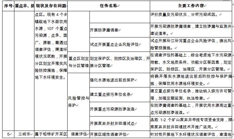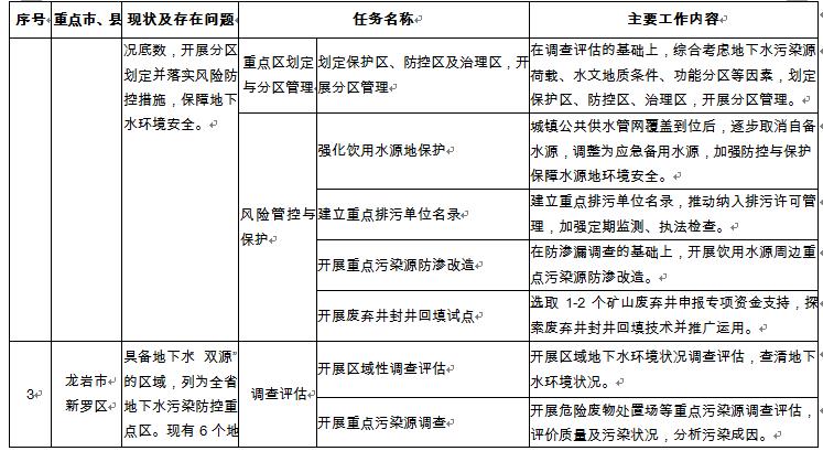 1.污染防治重點(diǎn)區(qū)劃定及分區(qū)管理試點(diǎn)。開展九市一區(qū)地下水污染防治重點(diǎn)區(qū)劃定工作。在龍巖新羅和連城、三明大田開展地下水環(huán)境分區(qū)管理試點(diǎn)。 2.重點(diǎn)污染源地下水污染風(fēng)險(xiǎn)管控與修復(fù)。實(shí)施重點(diǎn)污染源(化工園區(qū)、危險(xiǎn)廢物處置場(chǎng)和生活垃圾填埋場(chǎng)等)地下水污染風(fēng)險(xiǎn)管控,以省級(jí)以上化工園區(qū)為重點(diǎn)開展地下水污染風(fēng)險(xiǎn)管控。開展漳州古雷港開發(fā)區(qū)重點(diǎn)企業(yè)地下水污染風(fēng)險(xiǎn)管控與修復(fù)試點(diǎn)。 3.礦山廢棄井封井回填。探索廢棄井封井回填技術(shù),在三明市尤溪縣等礦山開采集中的區(qū)域開展廢棄井回填試點(diǎn)。 |
