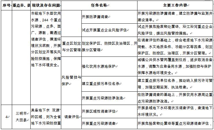 1.區(qū)域地下水環(huán)境狀況調(diào)查評(píng)估。在九市一區(qū)開展市級(jí)的地下水環(huán)境狀況調(diào)查評(píng)估,摸清區(qū)域地下水環(huán)境質(zhì)量狀況。 2.化工園區(qū)地下水環(huán)境狀況調(diào)查評(píng)估。以省級(jí)以上化工園區(qū)為重點(diǎn),開展全省化工園區(qū)地下水環(huán)境狀況調(diào)查評(píng)估。 3.非化工類重點(diǎn)排污單位地下水環(huán)境狀況調(diào)查及監(jiān)測(cè)。開展危險(xiǎn)廢物處置場(chǎng)、垃圾填埋場(chǎng)地下水環(huán)境狀況調(diào)查評(píng)估;開展上杭紫金山金銅礦等礦山開采區(qū)地下水環(huán)境狀況調(diào)查評(píng)估;地下水重點(diǎn)排污單位開展地下水環(huán)境狀況調(diào)查監(jiān)測(cè)。 |