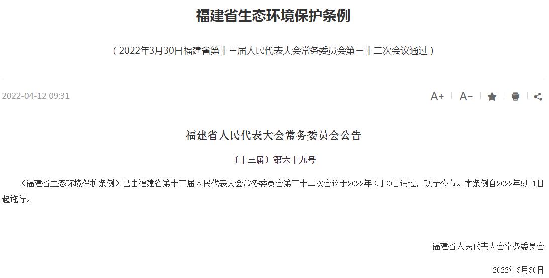 第七十四條 本條例自2022年5月1日起施行。1995年7月5日福建省第八屆人民代表大會常務(wù)委員會第十八次會議通過,2002年1月20日福建省第九屆人民代表大會常務(wù)委員會第三十次會議修訂,根據(jù)2012年3月29日福建省第十一屆人民代表大會常務(wù)委員會第二十九次會議通過的《福建省人民代表大會常務(wù)委員會關(guān)于修改部分地方性法規(guī)的決定》修正的《福建省環(huán)境保護條例》同時廢止。